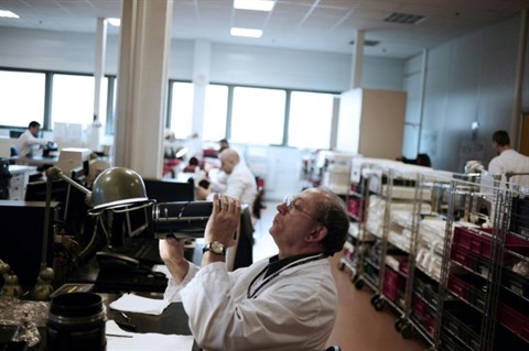 Dans l'atelier des jumelles de vision nocturne, lentilles, tube d'intensification de lumière et pièces mécaniques sont assemblés sur des tables de travail équipées de puissantes lampes et de hottes pour aspirer les émanations de colles et produits chimiques.