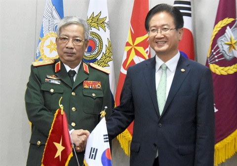| Le général de corps d’armée Nguyên Chi Vinh, vice-ministre vietnamien de la Défense et son homologue sud-coréen, Suh Choo-suk, le 8 septembre à Hanoï. |