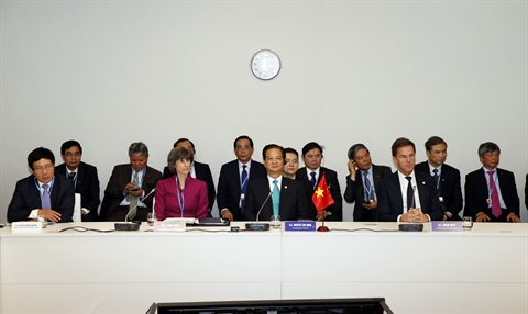 | Le Premier ministre Nguyên Tân Dung (1er plan, 2e à droite) lors d'un dialogue entre le Vietnam, les Pays-Bas et la BM, le 30 novembre à Paris. |