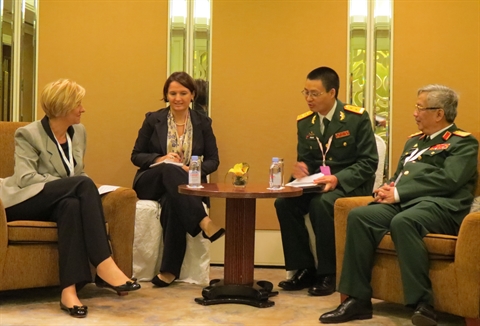 | Rencontre entre le vice-ministre vietnamien de la Défense, le général Nguyên Chi Vinh (premier à droite), et la ministre italienne de la Défense, Roberta Pinotti (premier à gauche), le 3 juin à Singapour. |