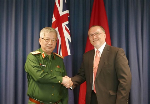 | Le général de corps d'armée Nguyên Chi Vinh, vice-ministre vietnamien de la Défense (gauche), et Marc Ablong, secrétaire général adjoint de la Défense de l’Australie. |