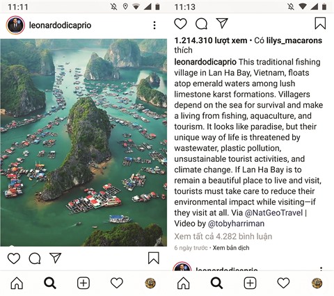 Leonardo DiCaprio a écrit : "Ce village de pêche traditionnel de la baie de Lan Ha, au Vietnam, flotte sur des eaux émeraudes et est niché au pied de roches calcaires dantesques. Les villageois dépendent de la mer pour survivre et gagner leur vie, que ce soit par la pêche, l’aquaculture ou le tourisme. Cela ressemble à un paradis mais leur mode de vie unique est menacé par les eaux usées, la pollution, le plastique, les activités touristiques non durables et le changement climatique. Si la baie de Lan Ha doit rester un bel endroit, pour y vivre et pour le tourisme, les visiteurs doivent prendre soin de réduire leur impact environnemental lors de leur visite".
