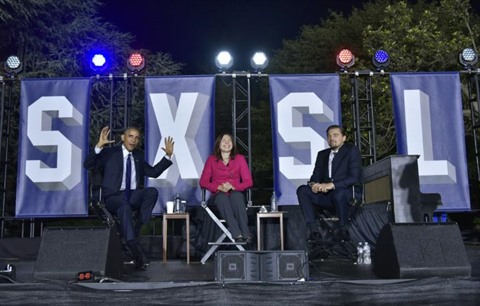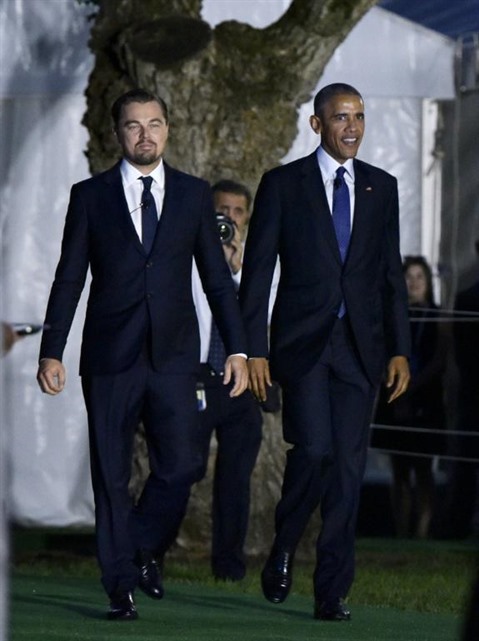 | Leonardo DiCaprio (gauche) et Barack Obama arrivent au festival "South by South Lawn", le 3 octobre à Washington. |