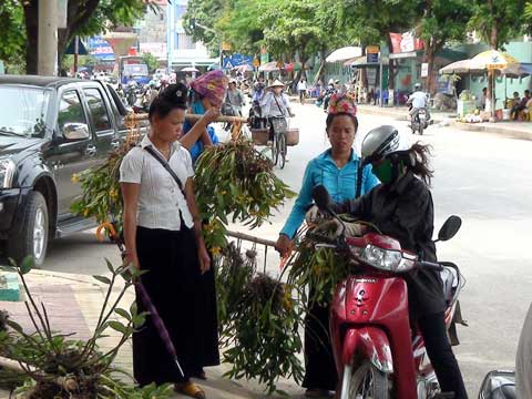 Sur le bord de la route menant au poste de commandement du général Vo Nguyên Giap, dans une forêt de la commune de Muong Phang, à 27 km de la ville de Diên Biên Phu, des membres de l’ethnie Thai vendent un grand nombre de branches d’orchidées forestières de différentes espèces. Le prix varie de 50.000 à 100.000 dôngs par branche.