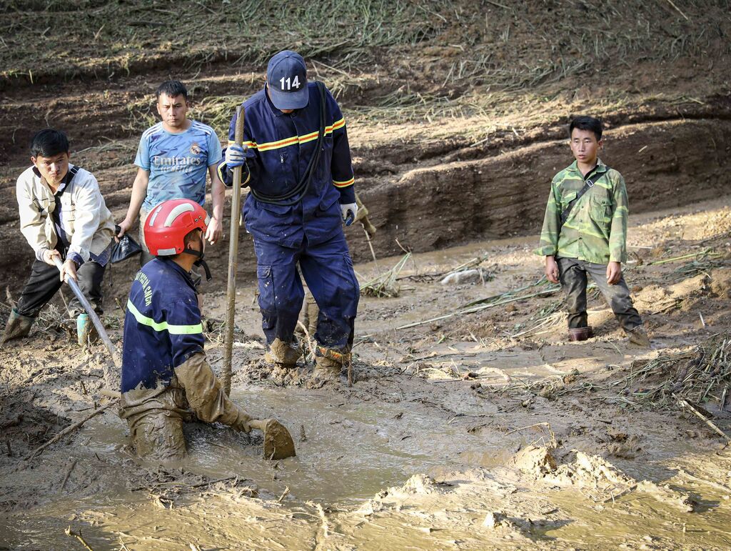| Mùa A Thi (droite) et des secouristes à la recherche des victimes disparues suite aux glissements de terrain dans le village de Háng Pu Xi, commune de Xa Dung (province de Diên Biên), le matin du 2 août. |