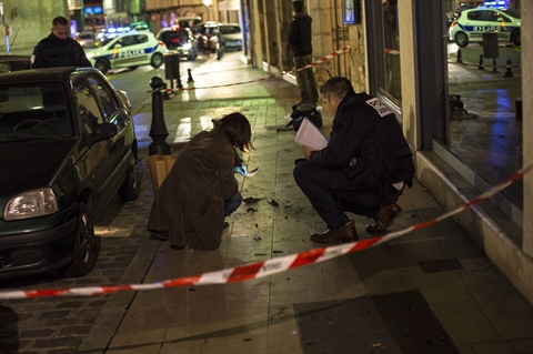 | Des policiers s'affairent là où un chauffard a volontairement percuté des passants. |