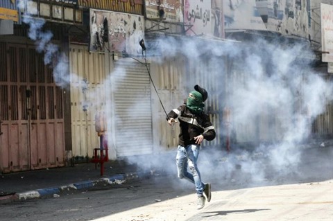| Un manifestant palestinien renvoie une cartouche de gaz lacrymogène sur des soldats israéliens le 31 mars à Hébron, en Cisjordanie. |