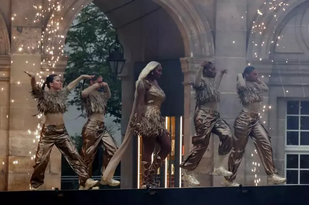 Des plumes, encore, mais figées et dorées cette fois-ci : la popstar Aya Nakamura a brillé, toute d'or vêtue, des paupières aux spartiates montantes rappelant les mythes antiques, au milieu de ses danseuses elles aussi en plumes et pantalon or clinquant.