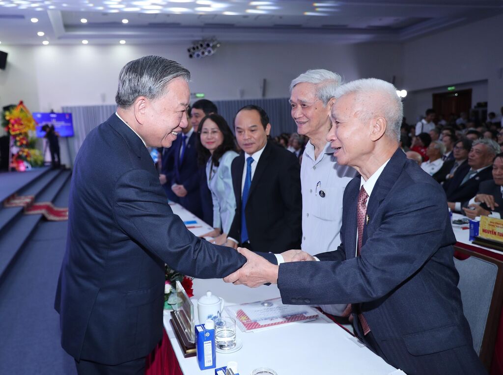 | Le secrétaire général Tô Lâm (gauche) rencontre des anciens dirigeants de la VNA lors de la cérémonie. |