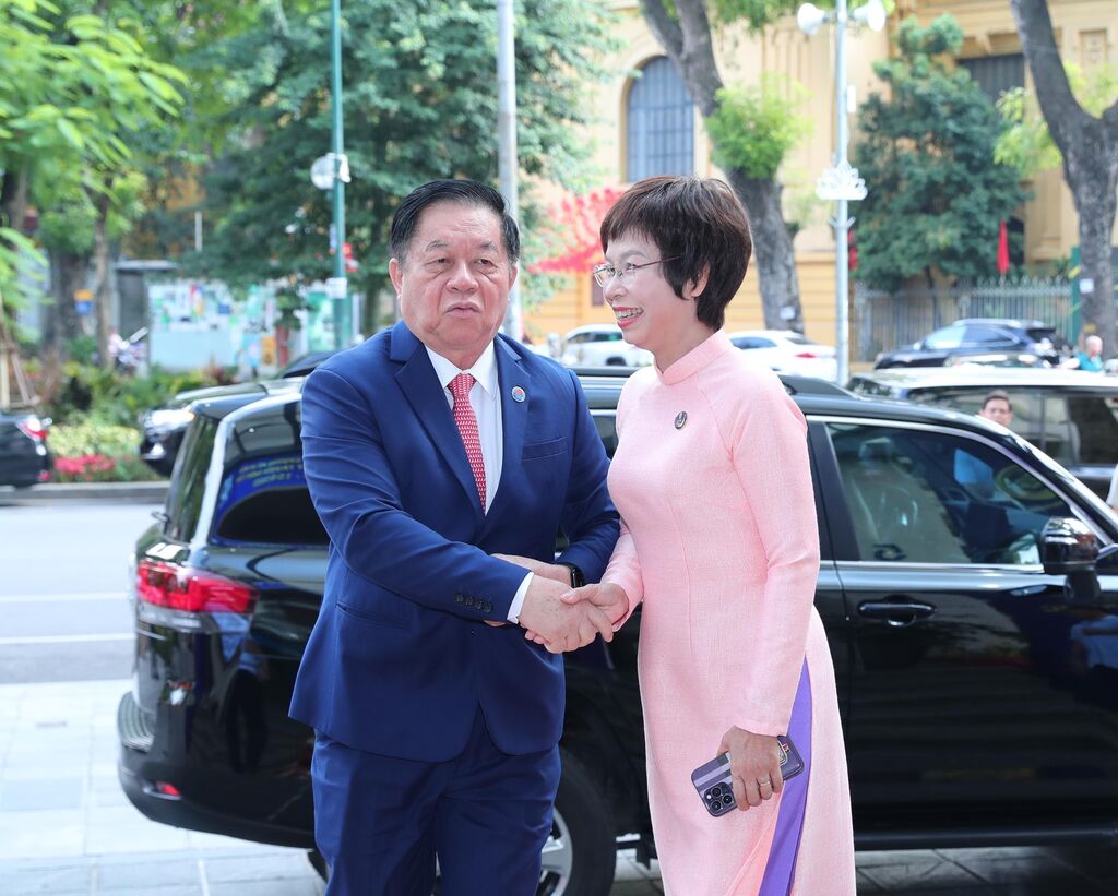 | Nguyên Trong Nghia, membre du Politiburo, secrétaire du Comité central du Parti et chef de la Commission de la sensibilisation, de l'éducation et de la mobilisation des masses, est accueilli par la directrice générale de la VNA, Vu Viêt Trang. |