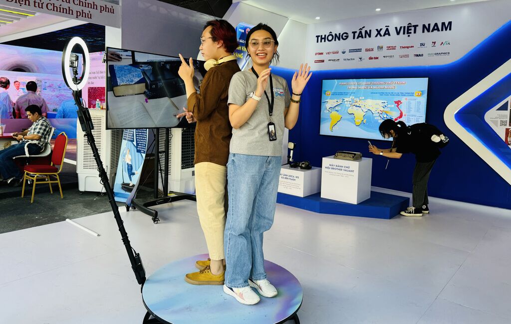 | Les visiteurs utilisent les nouvelles technologies pour prendre des photos aux stands de l’Agence Vietnamienne d’Information. |