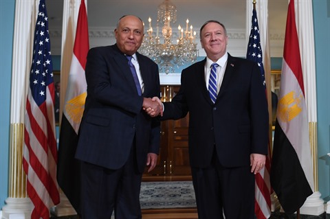 | Le ministre égyptien des Affaires étrangères, Sameh Shoukry, et le secrétaire d'État américain Mike Pompeo (droite) lors d'une réunion à Washington, le 9 décembre 2019. |