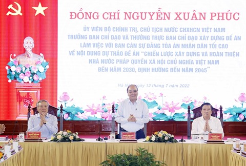 Le président Nguyên Xuân Phuc, chef du Comité de direction pour l’élaboration du projet de "Stratégie pour édifier et perfectionner l'État de droit socialiste au Vietnam d’ici 2030 et orientation vers 2045" a présidé le 12 juillet à Hanoï une séance de travail entre la Permanence du Comité de direction et le Comité chargé des affaires du Parti de la Cour populaire suprême sur le contenu du projet.