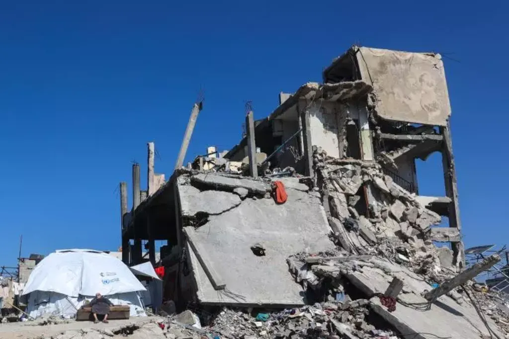 | Un Palestinien devant sa tente, à côté des ruines d'un immeuble à Jabalia, dans le nord de la bande de Gaza, le 27 février. |