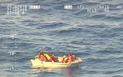 | Capture d'écran fournie par les forces militaires de la Nouvelle-Zélande d'un canot de sauvetage transportant le 28 janvier, sept survivants d'un ferry en perdition au large des îles Kiribati. |