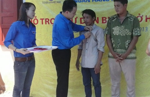 | Le vice-président de l’Union des jeunes du Vietnam, Lo Quang Tú, remet le 28 mars l’insigne de la jeunesse courageuse à deux pêcheurs Pham Quang Thanh et Bùi Van Phai. Photo : CTV/CVN |