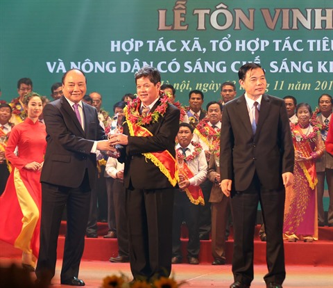 | Le premier ministre Nguyên Xuân Phuc (à gauche) lors de la cérémonie des coopératives et agriculteurs exemplaires organisés à Hanoï le 13 novembre. |