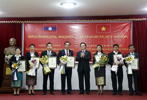 | Cérémonie de remise de l'Ordre de l'indépendance de 3e classe et l'Ordre de l'amitié à 17 fonctionnaires du Laos, le 4 février à Vientiane. |