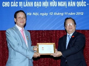 | Le président de l'Union des organisations d'amitié du Vietnam, Vu Xuân Hông (droite), remet l'insigne "Pour la paix et l'amitié entre les nations" à Lee Sang Mo, vice-président de l'Association d'amitié République de Corée-Vietnam, le 12 novembre à Hanoi. |