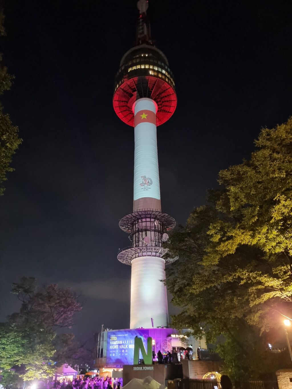 | L’image du drapeau national vietnamien diffusée au sommet de la tour Namsan. |