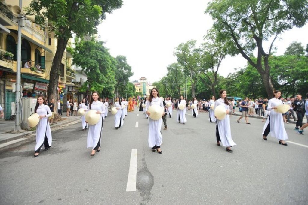 | Un défilé de l'"ao dài" à côté du lac Hoàn Kiêm. |