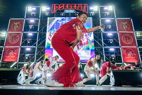 | Le Sud-Coréen Psy, auteur du tube planétaire Gangnam Style, en concert à l'Université de Corée à Séoul le 27 mai. |