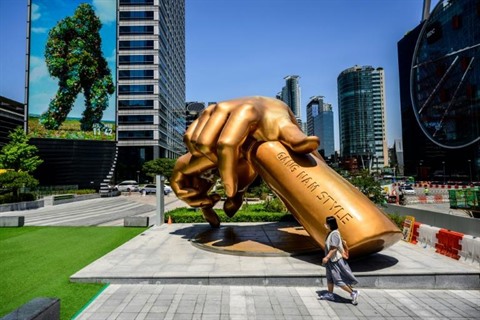 | Une œuvre du sculpteur sud-coréen Hwang Man-seok à la gloire de Gangnam Style, le 1er juin dans le quartier de Gangnam à Séoul. |