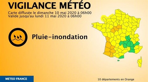 Sur la région Centre-Val de Loire des orages forts sont prévus en soirée. Les fortes intensités pluvieuses (de l'ordre de 20 à 30 mm/h) pourront provoquer des phénomènes d’inondation par ruissellement. Les cumuls attendus en moins de 24 heures sont de 30 à 50 mm en moyenne et dépasseront localement 70 mm. L'amélioration interviendra lundi après-midi 11 mai.