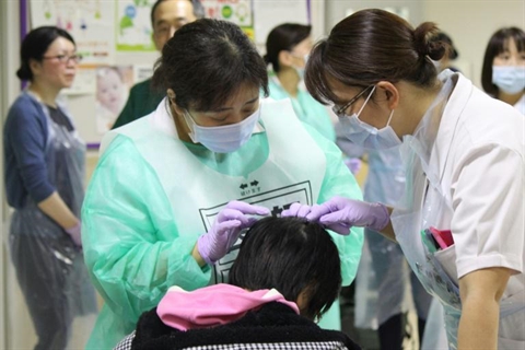 | Des urgentistes s'occupent d'un patient devant un hôpital à Kumamoto sur l'île de Kyushu dans le Sud-Ouest du Japon le 16 avril touchés par une série de séismes. |