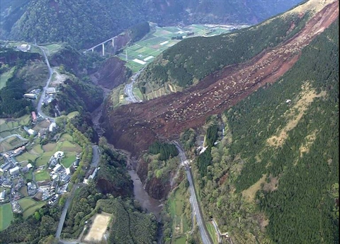 | Vue aérienne fournie par les autorités japonaises du site du glissement de terrain dans la préfecture de Kumamoto (sud du Japon), le 16 avril. |