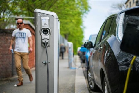 | Des voitures électriques en charge dans une rue d'Oslo. |