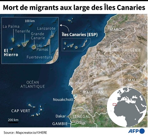 Le bateau avait d'abord été repéré par un avion de l'armée espagnole à quelque 265 milles marins (environ 500 km) au Sud-Est de l'île d'El Hierro, la plus petite des Canaries, et un navire de secours en mer a été envoyé dans la zone.