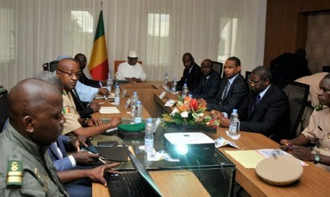 | Conseil de sécurité autour du président malien Ibrahim Boubacar Keita, le 19 juillet à Bamako, après l'attaque du camp de Nampala. |