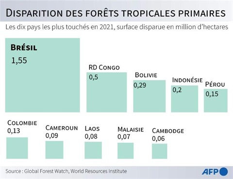 Plus de 40% de la forêt primaire perdue en 2021 l'a été au Brésil, avec environ 1,5 million d'hectares coupés ou partis en fumée, suivi par la République démocratique du Congo avec près de 500.000 ha détruits.