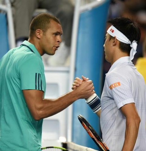 | Jo-Wilfried Tsonga (gauche), battu par Kei Nishikori en 8e de finale de l'Open d'Australie, serre la main de son adversaire, le 24 janvier à Melbourne. |