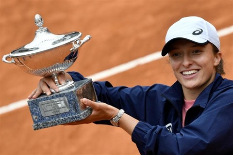 | La Polonaise Iga Swiatek brandit son trophée du Foro Italico après sa victoire en finale sur la Tchèque Karolina Pliskova, à Rome, le 16 mai. |