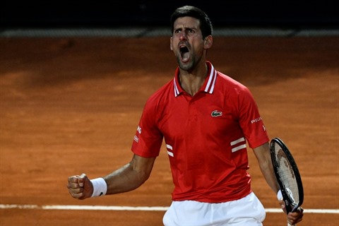 | La joie du Serbe Novak Djokovic après un point gagnant, lors de sa demi-finale contre l'Italien Lorenzo Sonego à l'Open d'Italie, le 15 mai au Foro Italico à Rome. |