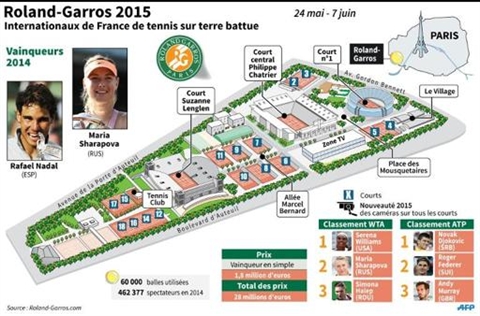 | Plan du stade de Roland-Garros avec présentation du tournoi 2015, classement des joueurs et vainqueurs en 2014. |