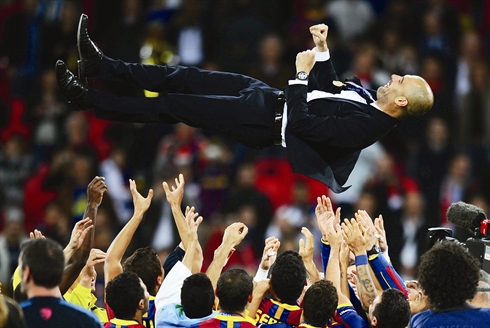 | L’entraîneur de Barcelone, Josep Guardiola, glorifié par ses joueurs. |