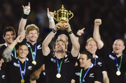 | Les All Blacks portent en haut la Coupe du monde de rugby. |