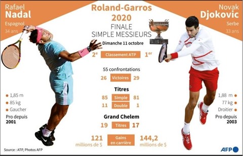 Il s'agira du 56e duel entre les deux hommes, le 9e en finale de Grand Chelem (quatre victoires chacun). Au total, Djokovic a gagné 29 fois, Nadal 26.