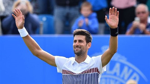 | Le Serbe Novak Djokovic salue les supporters après sa victoire face à l'Allemand Daniil Medvedev en demie du tournoi d'Eastbourne, le 30 juin 2017. |