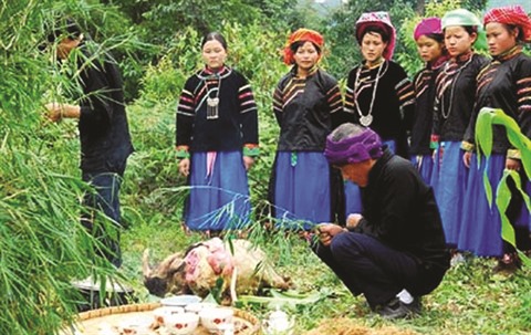 Dans la forêt profonde, un autel haut de 2 m est érigé à l’ombre d’un grand arbre, sur lequel sont déposées des offrandes : riz gluant, coq bouilli, plats de viande de porc, de chèvre, de bœuf… En présence de tout le monde, le sorcier allume des bâtonnets d’encens, se prosterne devant l’autel, et prie pour la santé, la prospérité et la vie paisible des habitants, une météo favorable à de bonnes récoltes…