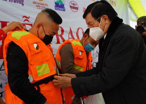 | L'ex-président Truong Tân Sang offert des gilets de sauvetage à des pêcheurs de la province de Quang Binh (Centre), le 15 novembre. |