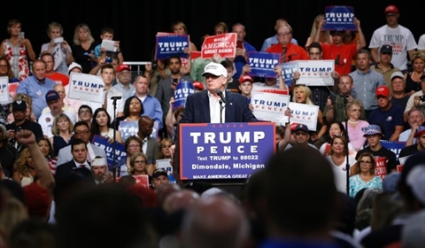 | Donald Trump en meeting au Summit Sports and Ice Complex de Diamondale, dans le Michigan, le 19 août 2016. |