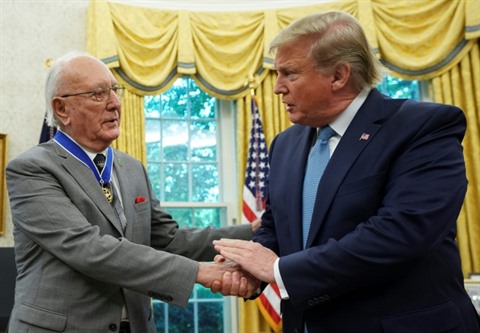 | Donald Trump (droite) décore de la "médaille de la liberté" Bob Cousy, légende du basket, le 22 août à la Maison Blanche, à Washington. |