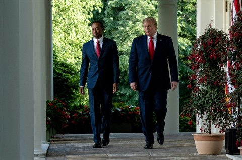 | Le président américain Donald Trump et le golfeur Tiger Woods à la Maison Blanche lors de la cérémonie de remise de la "médaille de la Liberté". |