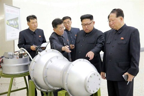 | Photo non datée diffusée par la KCNA le 3 septembre 2017 montre le dirigeant nord-coréen Kim Jong-Un (2e à droite) examinant une bombe H. |