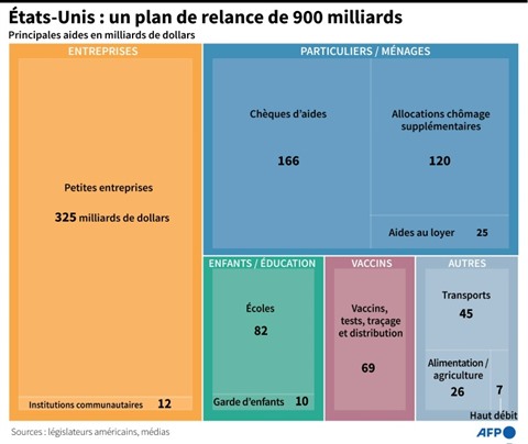 Le nouveau plan de relance prolonge jusqu'à mi-mars ces aides fédérales versées aux chômeurs, accorde des prêts garantis aux entreprises, prévoit des milliards de dollars d'aides aux PME, aux sociétés de la restauration, de l'hôtellerie, du transport aérien etc -- prolonge le moratoire interdisant les expulsions de personnes ne pouvant payer leur loyer, suspend les saisies immobilières et prévoit des fonds pour la distribution des vaccins anti-COVID.