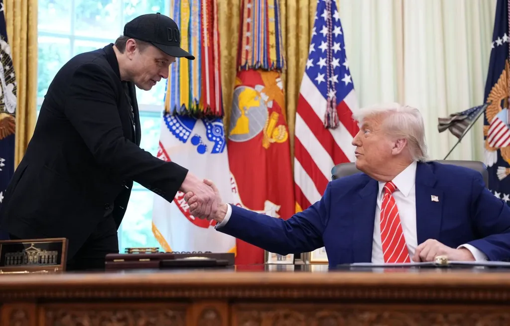 | Elon Musk serre la main du président américain, Donald Trump, alors qu’ils s’adressent aux journalistes dans le bureau ovale de la Maison-Blanche le 30 mai 2025. |